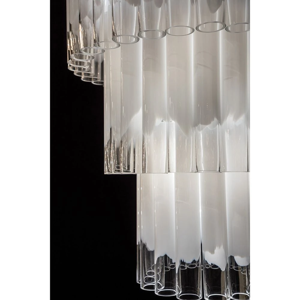 Each glass tube in our Tyrell family is purposely imperfect, frosted opal toward the top before raggedly giving way to perfect clarity by the base. Outer gloss gives them sheen, making for a mysterious and alluring diffusion effect as light comes blushing through from candelabra bulbs set perpendicular to each layer of glass tubes. Tyrell adds a 21st-century touch to a Modernist classic.