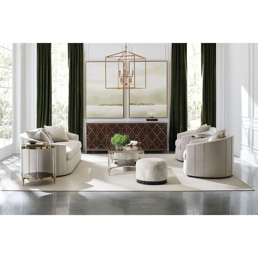 With a striking composition and material mix, this media console takes inspiration from a piece found while strolling the antique markets in Paris. Encased in Brushed Antique Brass paint, linear door fronts feature a slatted wood construction, separated by cube-shaped gold metal spacers to create an argyle diamond pattern. Features open storage behind center doors, with two drawers and adjustable shelves behind doors on either end. A cutout along the base allows for wire management