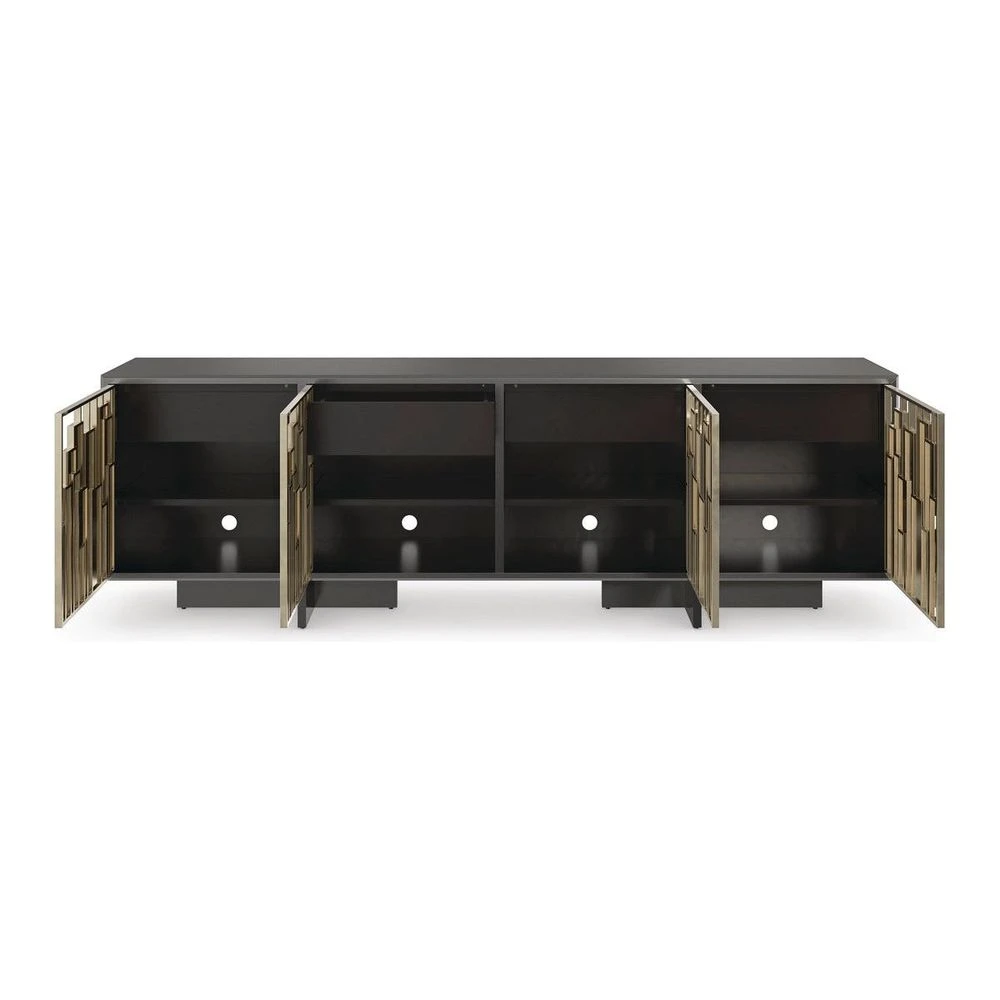 With an air of sophistication and modern luxury, this console calls to mind a dazzling city skyline at night. Uniquely crafted, its four doors feature inset panels with layered geometric shapes in a glimmering mix of metal finishes. Offers streamlined, tucked-away storage with four drawers and an adjustable shelf below. Cutouts in the back panel allow for wire management. Makes an unforgettable statement in hallways, living and media rooms.