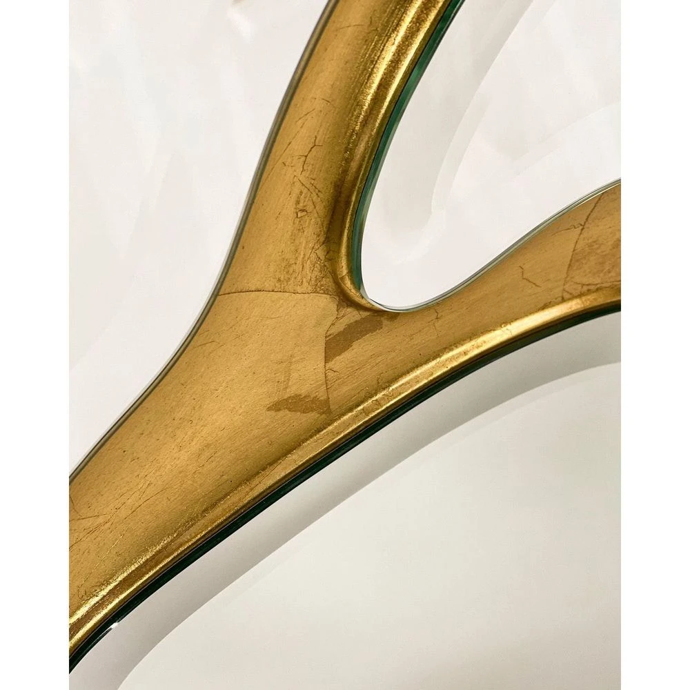 Description: This six-door credenza features modern beveled mirror fronts with an inset “Valora” pattern in a gold finish. The cabinet and base are finished in smoked oak.