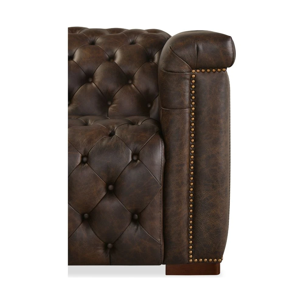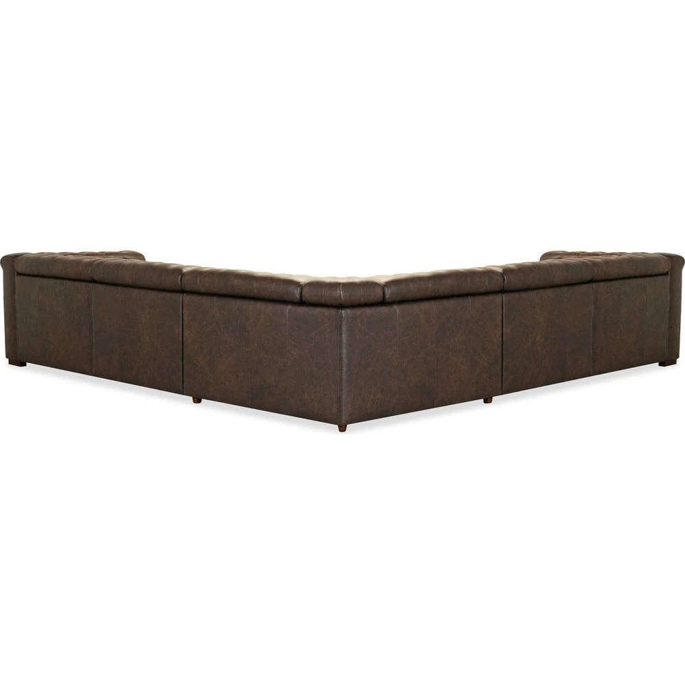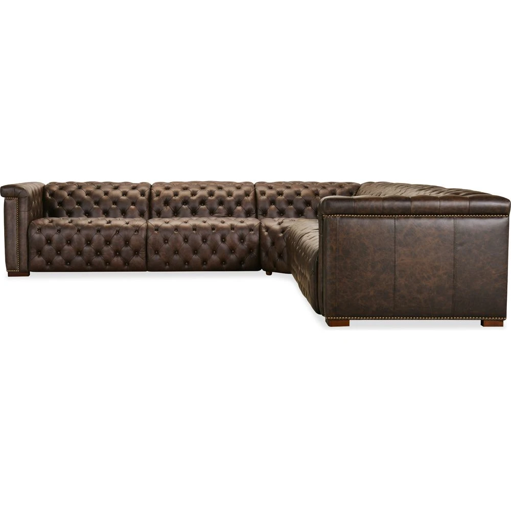 Description: This 5 Seat Sectional from the Vanguard Deux collection, upholstered in rich West Saddlewood leather, offers four power recliners and six power headrests for ultimate relaxation. Its dark wood finish, paired with classic chesterfield tufting and copper-toned nail trim, enhances the luxurious look. The thoughtfully designed power reclining seats, seamlessly integrated, make this sectional a sophisticated and functional addition to any living room.