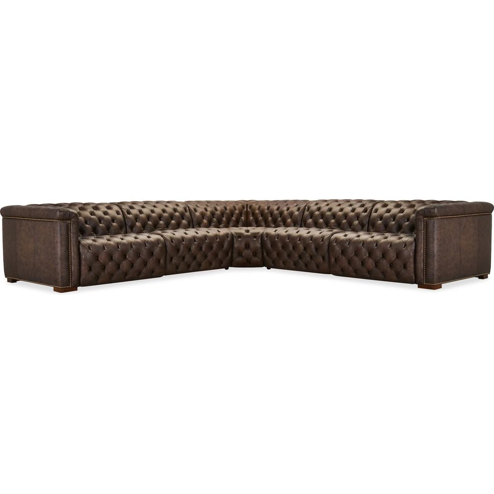 Description: The Vanguard Deux 5 Seat Sectional with three power recliners and six power headrests is upholstered in luxurious West Saddlewood Top Grain leather. This sectional features classic chesterfield tufting, copper-toned nail trim, and dark wood accents for a seamless blend of sophistication and comfort. With power reclining seats at each end and one armless seat, it’s the perfect centerpiece for a large living room.