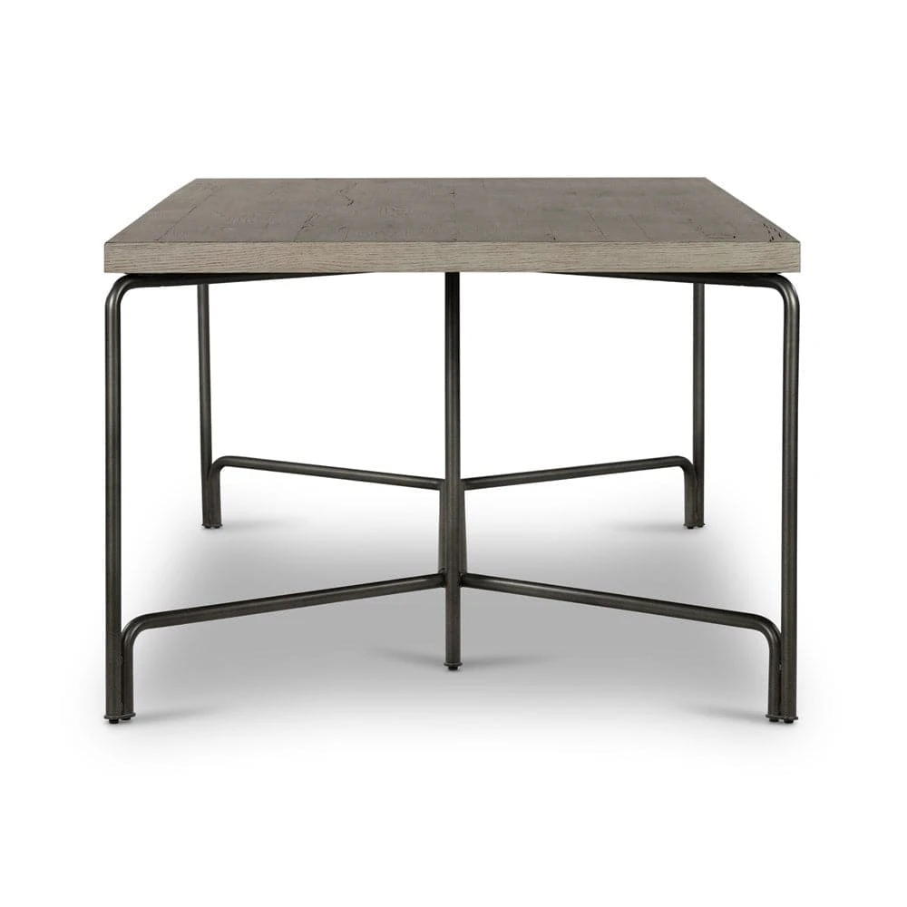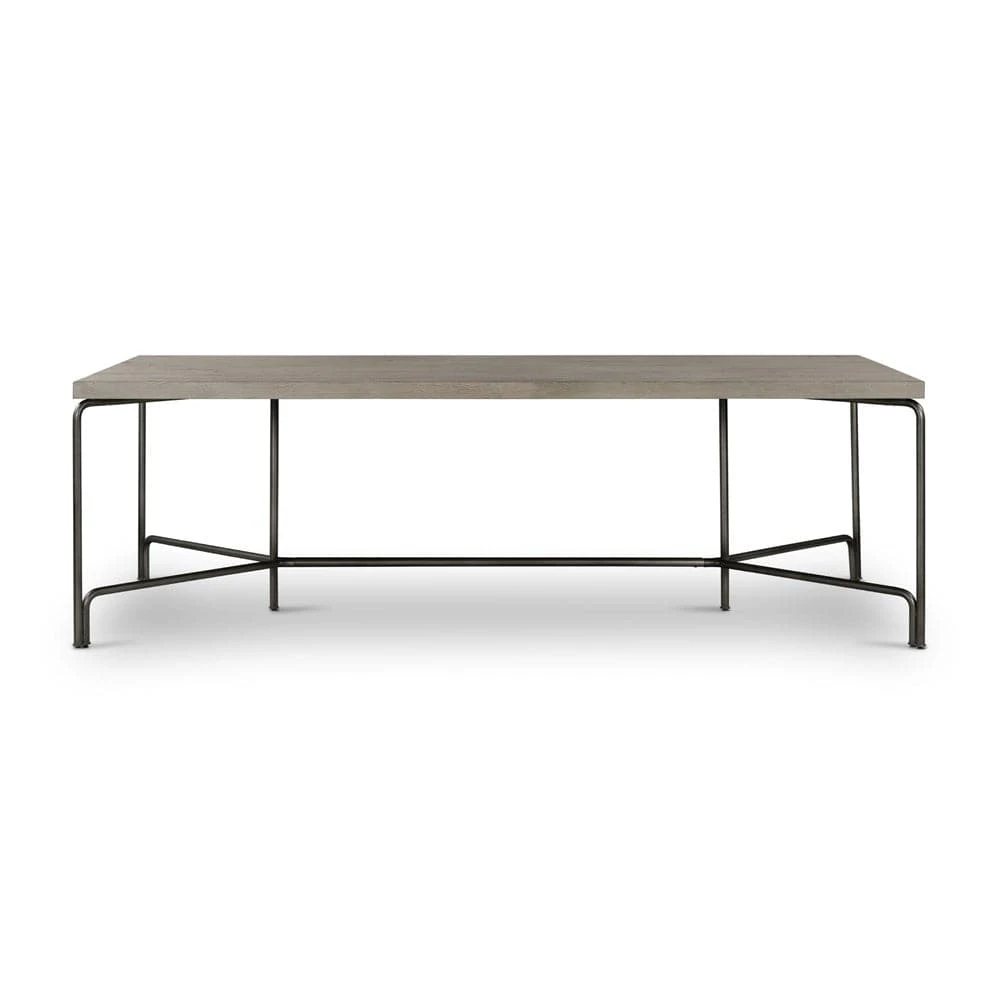 Add style and function to your dining space with the stunning Marion Dining Table, brought to you by Fourhands. This dining table features a long, lean design made from resawn oak and a tubular iron base finished in a brushed gunmetal color. The washed natural veneer adds a touch of warmth to the overall look. With a weight of 139.99 lbs, this dining table is both sturdy and stylish, making it the perfect addition to any home. The Marion Dining Table can seat eight comfortably, making it the perfect choice for dinner parties and family meals. Use this table to bring a touch of modern sophistication to your dining space.