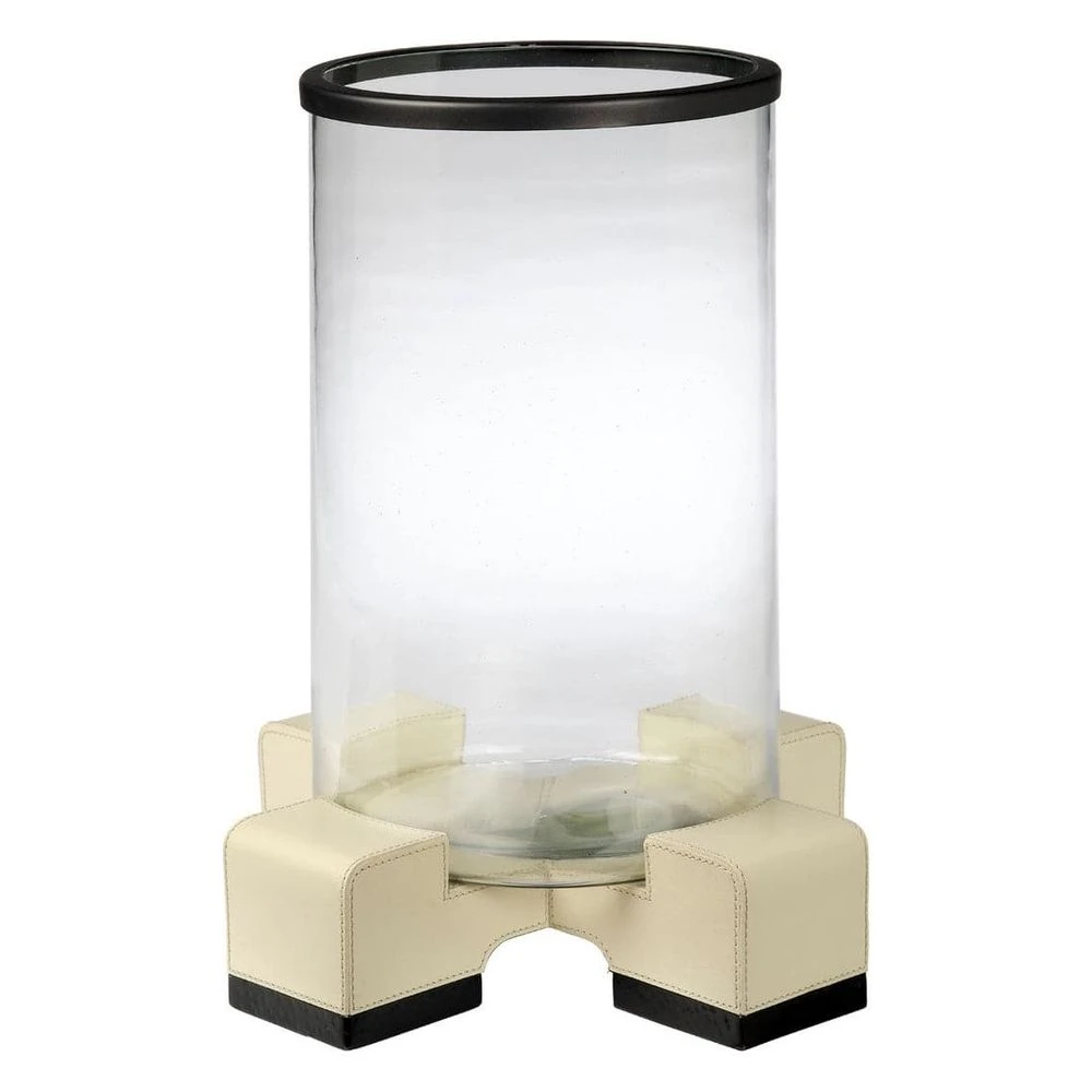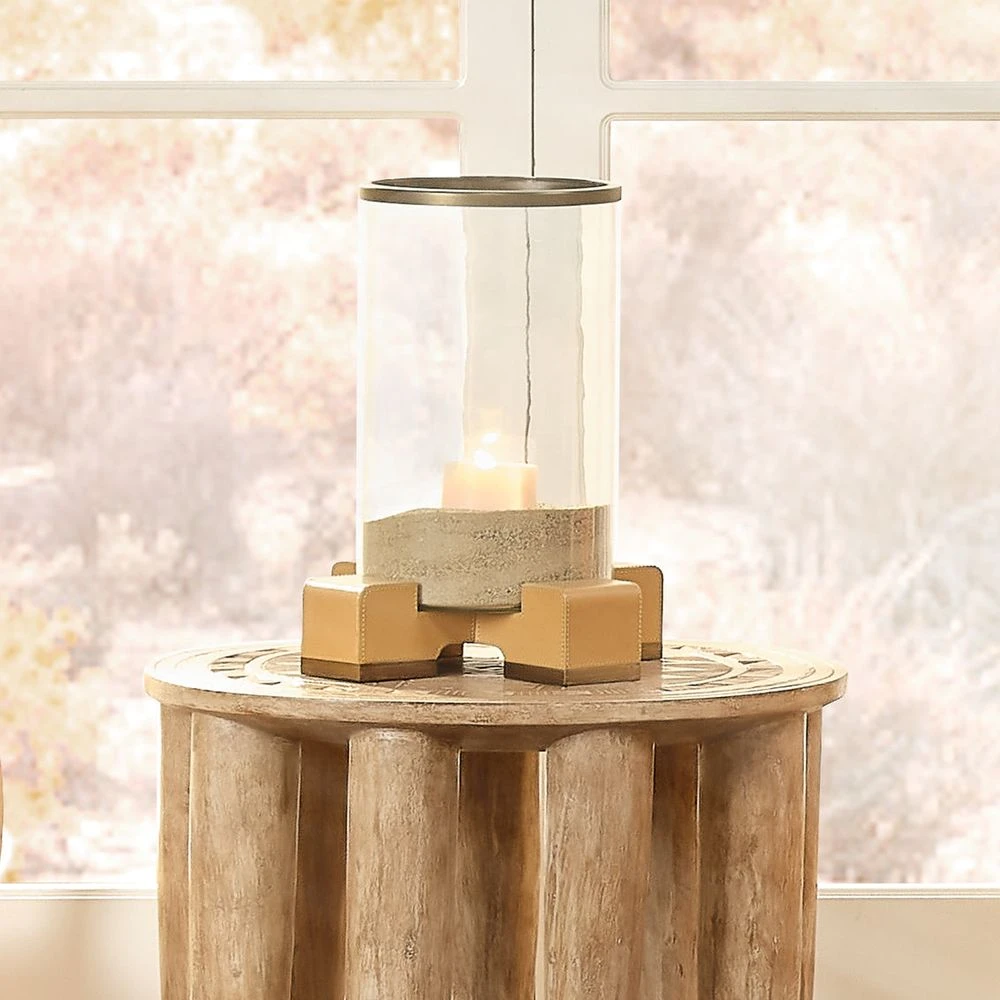 Edgy, elemental materials balance the softness of a candle’s glow in this contemporary take on a classic hurricane. A thick cylinder of hand-blown glass protects the candle’s fragile flame and is itself supported by a base covered in rich and creamy cashew leather. The top and bottom are banded in burnished brass. Customize the look with your own candle; try an ivory pillar for a monochromatic effect, or use a colored candle to coordinate with your decor.