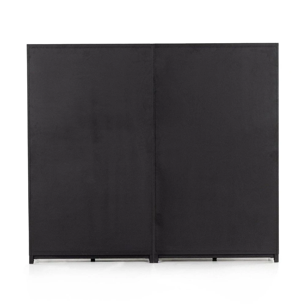 - Description: Two-tone transparency. Black drifted oak frames lighter interior shelving for subtle but striking contrast. Glass doors allow for prized possessions to dazzle on full display while spacious interior drawers add out-of-view storage.