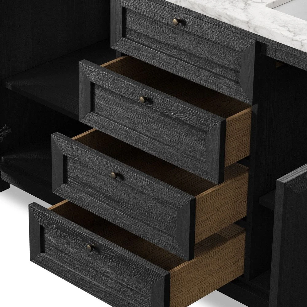 A sleek design built with tons of storage. Crafted with a thick oak veneer base in a satin black finish, a Carrera marble top and iron hardware in an antique bronze finish. A mix of drawers and cabinets offers plenty of storage. Drawers are fully finished in light natural oak; top drawer is not functional. Cabinets include removable shelves. Finished with a bath-safe sealant for moisture resistance. Designed to accommodate 8-widespread faucets and standard-size hardware for easy customization; faucet shown not included. Sink and backsplash included; backsplash ships separately. Removable back with cutouts for plumbing; fits standard P-trap. Professional installation required.