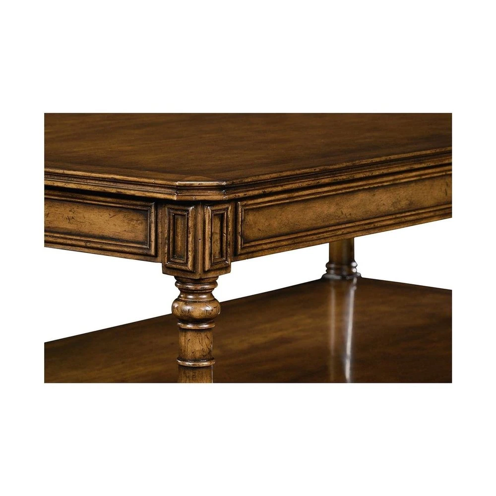 Rectangular walnut coffee table, the top with canted corners set above a panelled frieze and turned baluster legs around an undertier.