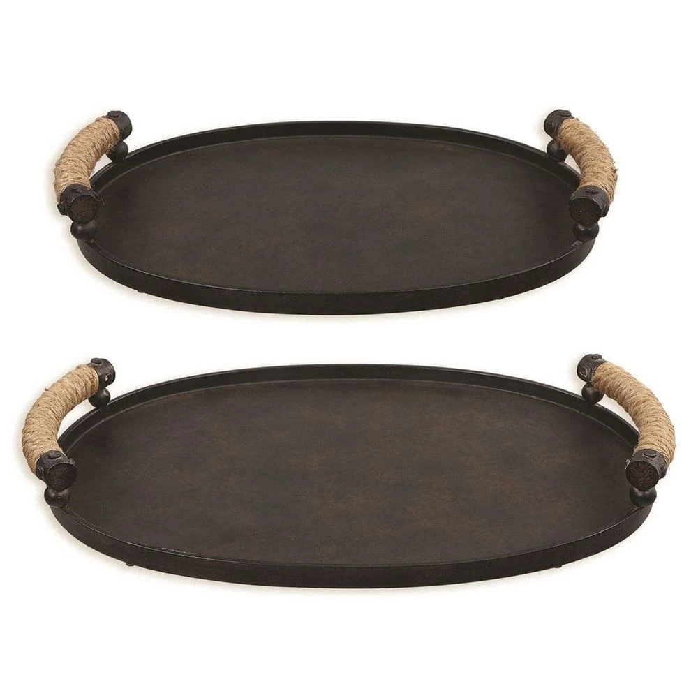 This set of iron trays is finished in a rustic oxidized bronze finish with natural rope wrapped handles.