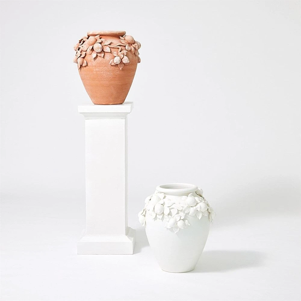 The Villa Limone Urn is meticulously crafted from Italian terracotta clay. Artisans hand-pack the clay into a mold through a process called Calco. Each mold is then left to dry for 2-3 days, during which the clay naturally shrinks, making it easy to remove the mold. The urn is then transferred to a kiln and fired at 950 degrees, resulting in a beautiful piece that can grace your space both indoors and outdoors, bringing timeless elegance to any setting.