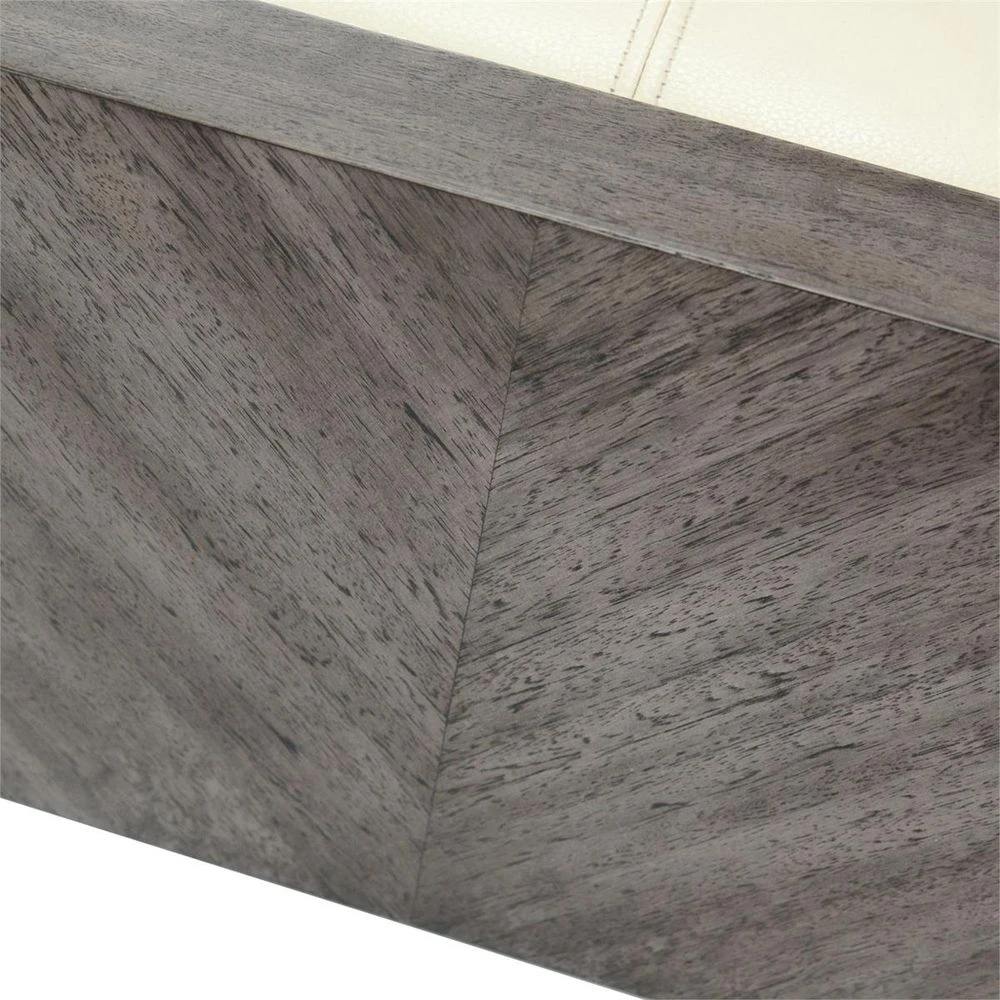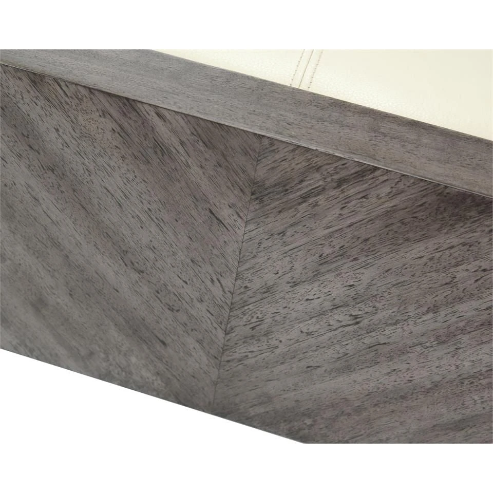 Description: This modern bench in figured eucalyptus is stained to a dark grey. This bench is upholstered with a fixed pad in a soft-hand, grained white leather with double-stitched, sectional tailoring.