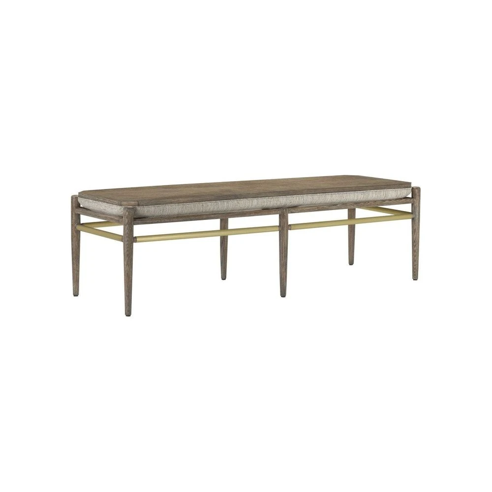 Description: The Visby Light Pepper Bench is made of solid oak in a light pepper finish with a linear brass accent in a brushed brass finish. The mid-century lines are enhanced by the rough ceruse treatment on the wood. The seat cushion of the brown bench is shown here upholstered in a Calcutta Linen fabric. It is reversible so that the Visby can be used either as a seat or a table.