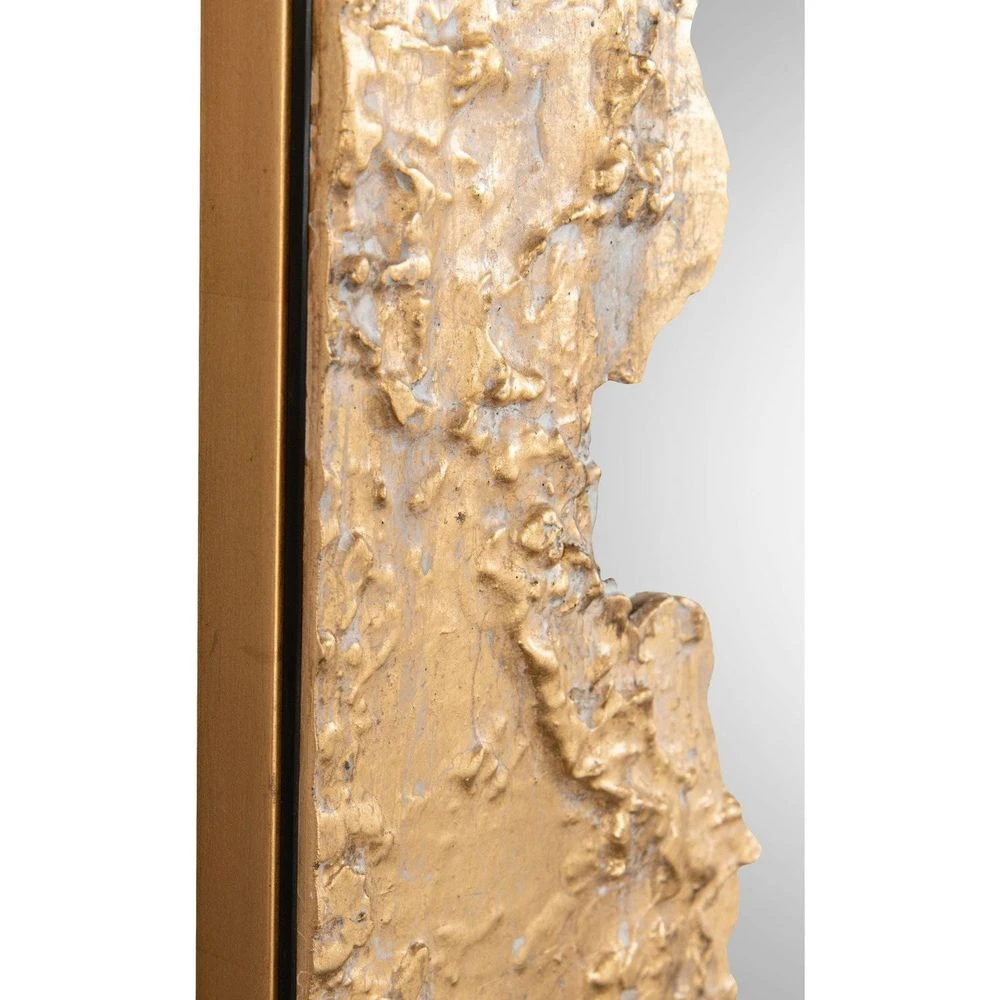 Description: This transitional mirror features side frames in a molten relief texture of washed gold and a gold coast finish. French cleats are fitted.