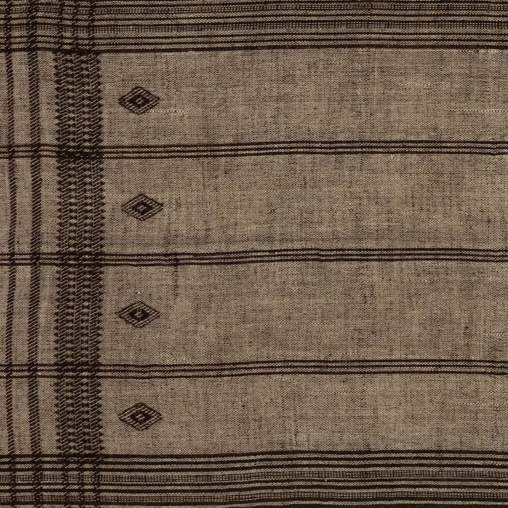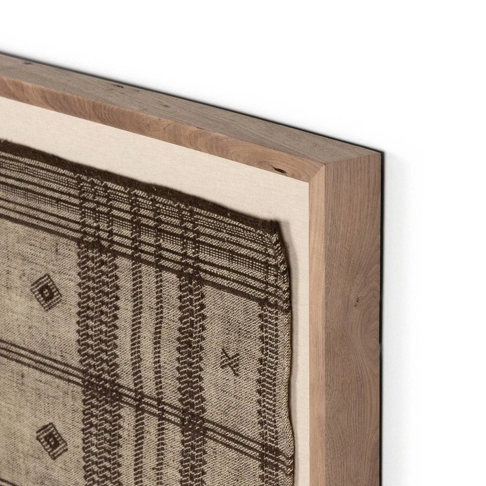 - Description: A Bhujodi-style textile is framed within rustic walnut for a gallery-quality look. Handmade in Austin, Texas.